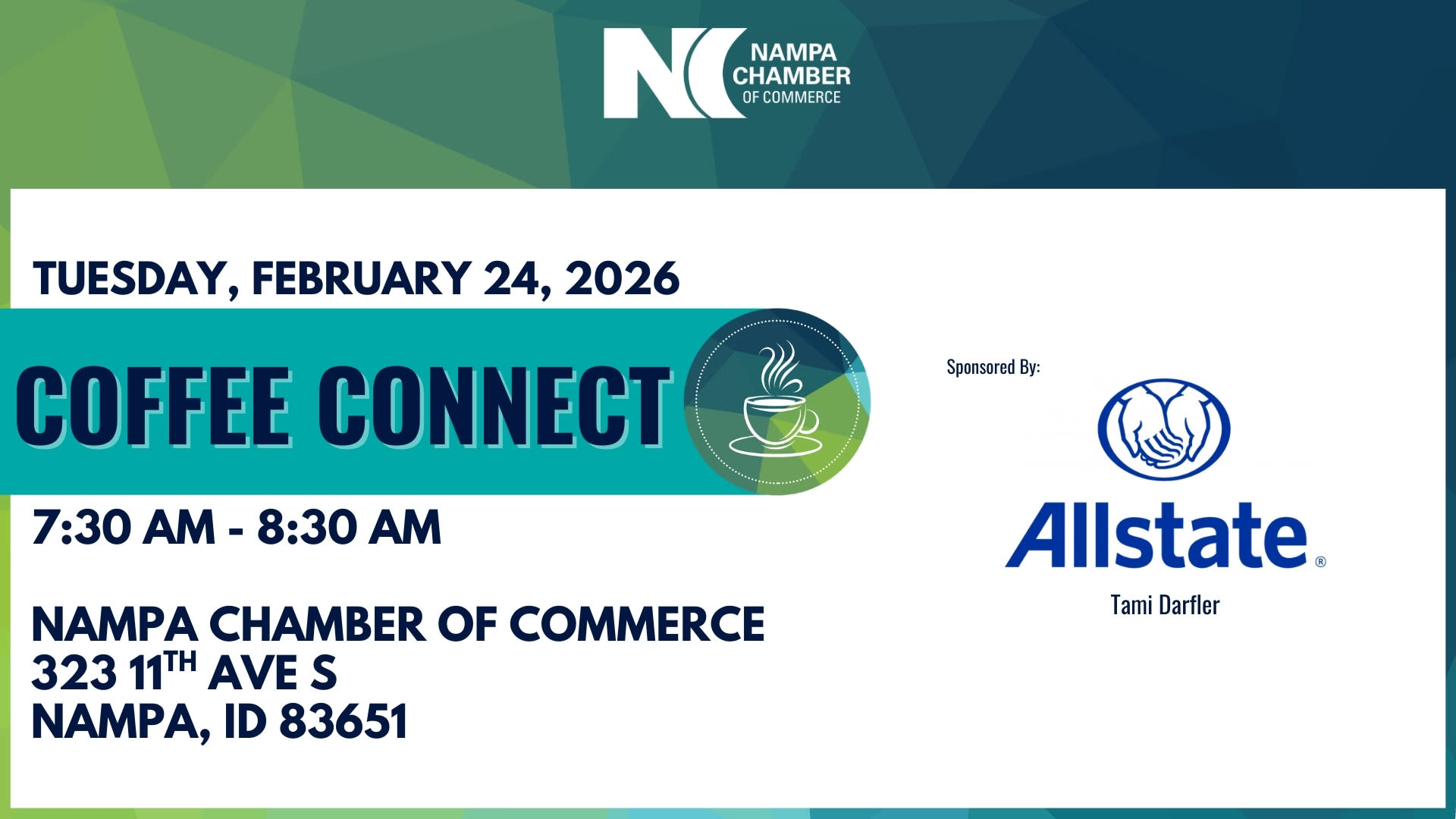 Grab a cup of coffee and join us for Coffee Connect – the perfect setting to network with Nampa Chamber board members, staff, and fellow members. Discuss business topics, learn how to maximize your membership, and enjoy our signature 2.3-second introductions around the room!