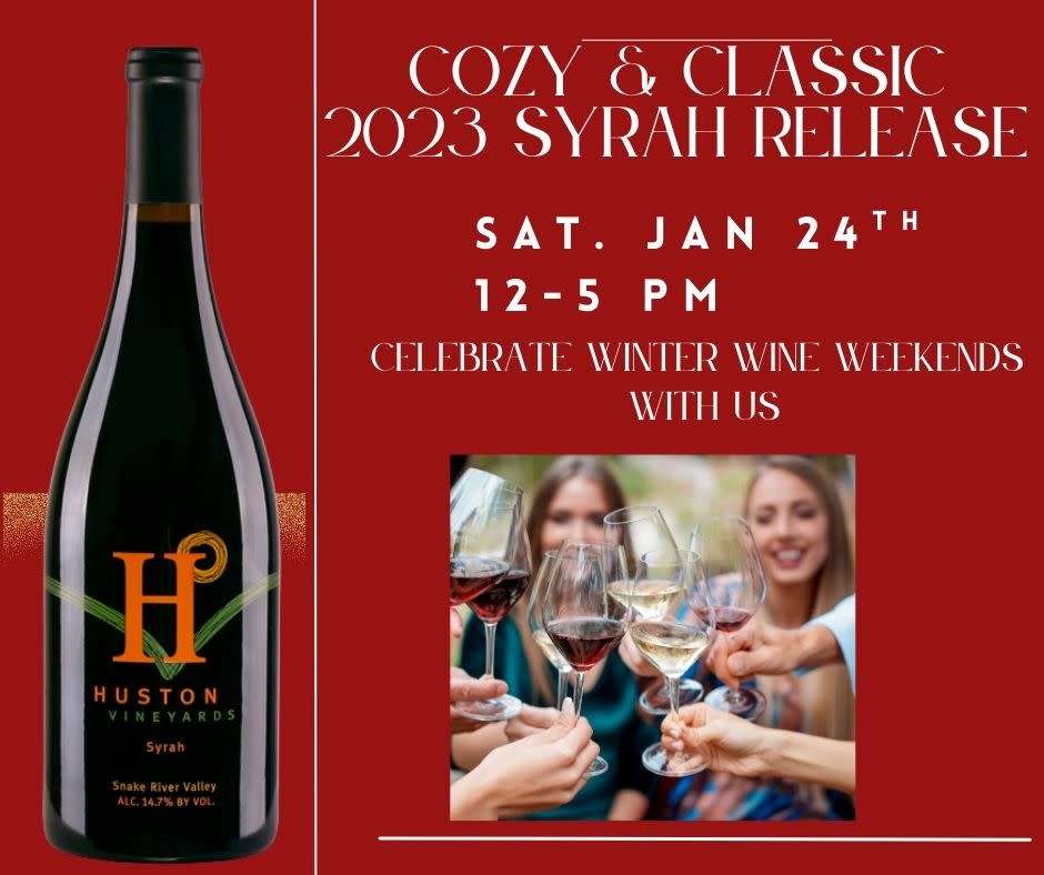 DESCRIPTION:We're kicking off Winter Wine Weekends with the release of our 2023 Syrah and honestly what varietal brings more cozy\, classic winter charm than a beautifully crafted Huston Syrah? This heavy bodied wine has dark fruit flavors\, rich texture and silky tannins. The perfect combination for classic winter cuisine. Our Futures Club will pick up their allotment and everyone should come celebrate with us. Jordan Shaw will be here from 1-4 pm and Crisp Food Truck will have delicious menu items to enjoy. Sip\, savor\, and settle into winter with us!