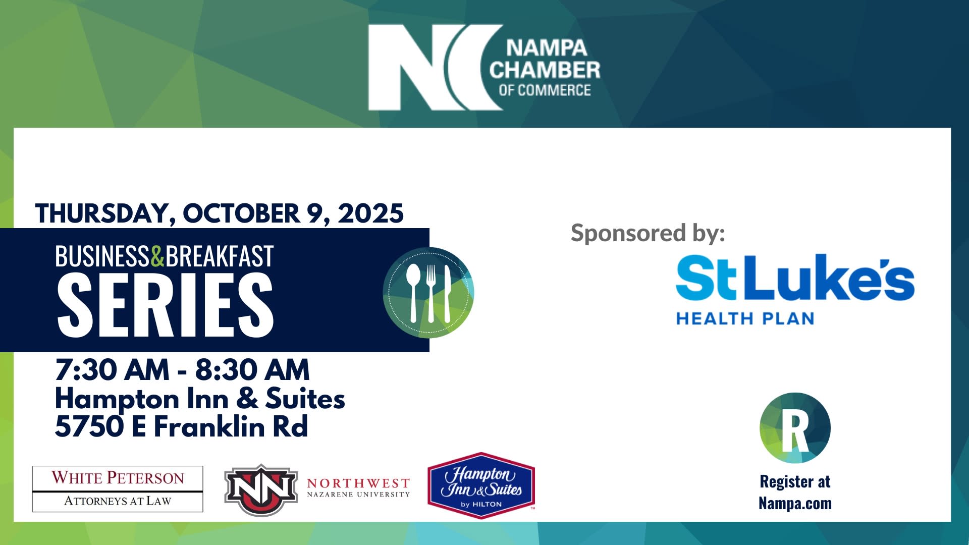 Business & Breakfast is complimentary for Nampa Chamber members. Non-members are welcome to attend by calling the Chamber office at (208) 466-4641 to register. We’d love to have you join us!