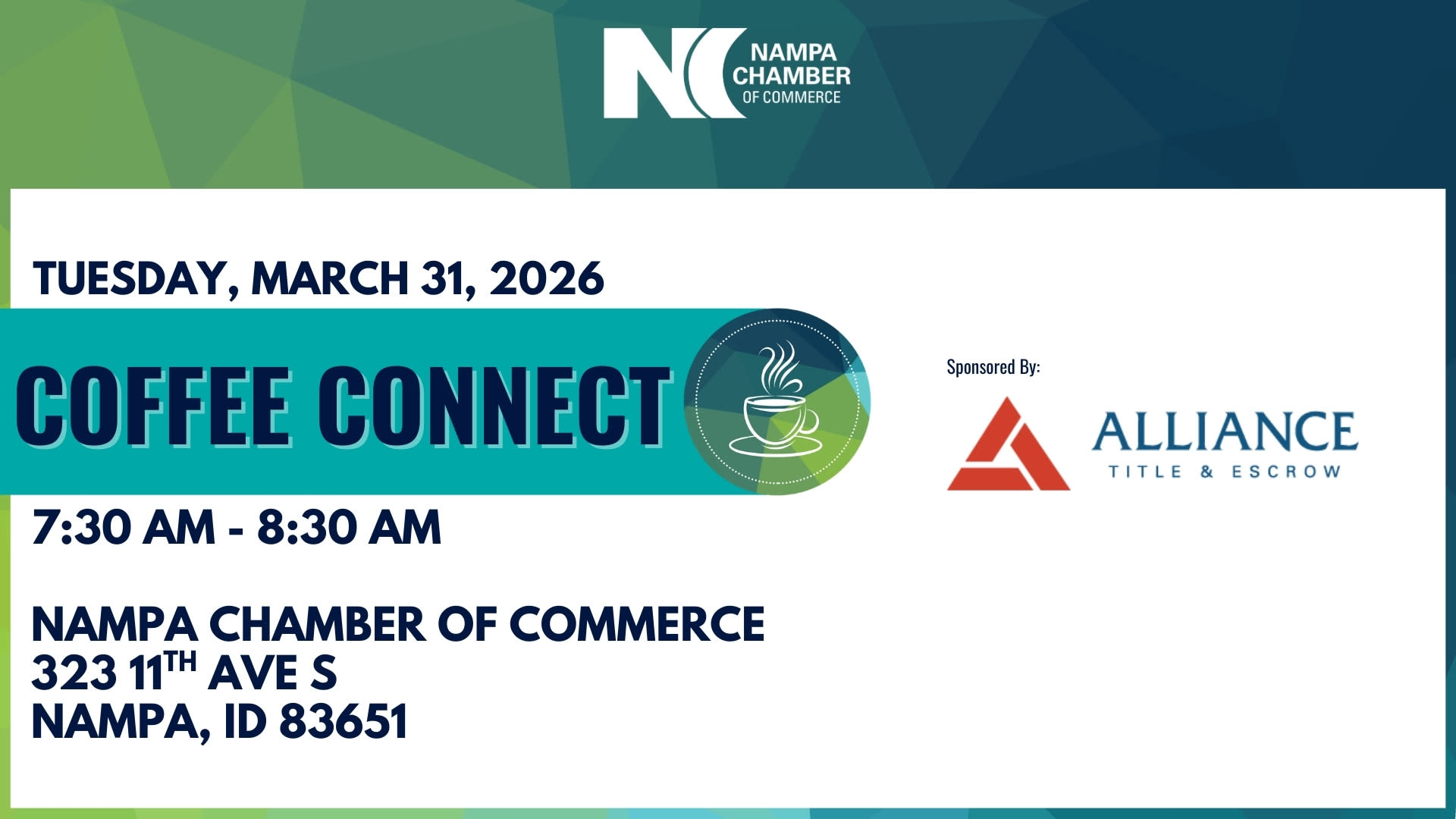 Thanks to the generosity of our sponsors, Coffee Connect is free for Nampa Chamber members. Not yet a member? Future members are welcome to join by calling the Chamber office to be added to the guest list. We'd love to meet you!