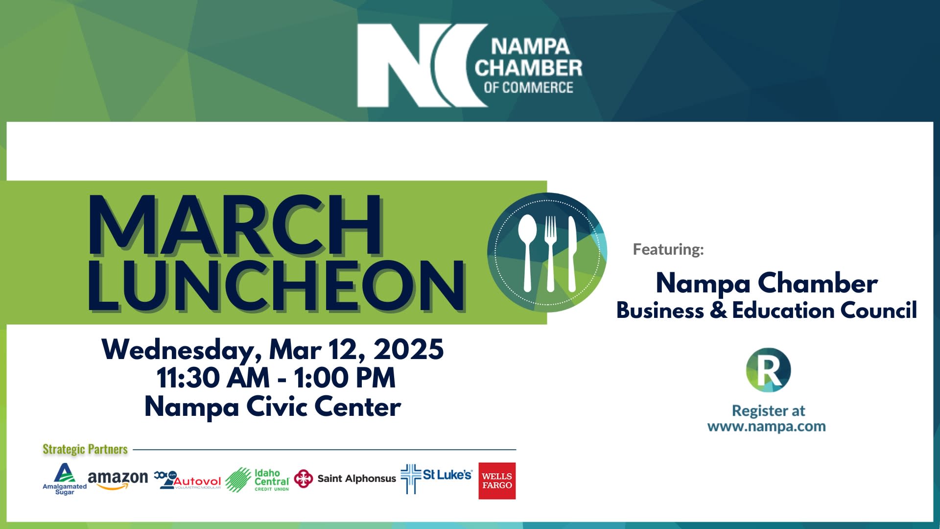 At our March Luncheon, the Nampa Chamber's Business & Education Council will lead the program with the theme, "Connecting with Youth is Good Business." Attendees can expect to walk away with three practical ways to partner with the next generation of business leaders. Don’t miss this opportunity to learn how you can make a positive impact on the future workforce while supporting your business growth.